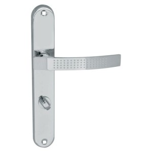 Klamka z długim szyldem jest wykonana w nowoczesnym stylu, o czym świadczy nie tylko kolor, ale również jej zdobienia znajdujące się bezpośrednio na powierzchni klamki. Produkt wykonano z aluminium – metalu, który charakteryzuje się niewielką wagą, jak również odpornością na uszkodzenia. Klamkę pokryto warstwą chromu, co nadaje jej miły dla oka wysoki połysk i odporność na korozję, dlatego produkt jest przeznaczony do zamontowania w drzwiach łazienki. Wbudowane pokrętło na zamek ze względu na dbałość o szczegóły wykonania przekręca się płynnie i cicho. Klamka oprócz swojego nowoczesnego wyglądu posiada ergonomiczny kształt, który ułatwia jej używanie, a wgłębienia na jej powierzchni zapewniają dobry chwyt dłoni wilgotnej bądź mokrej.